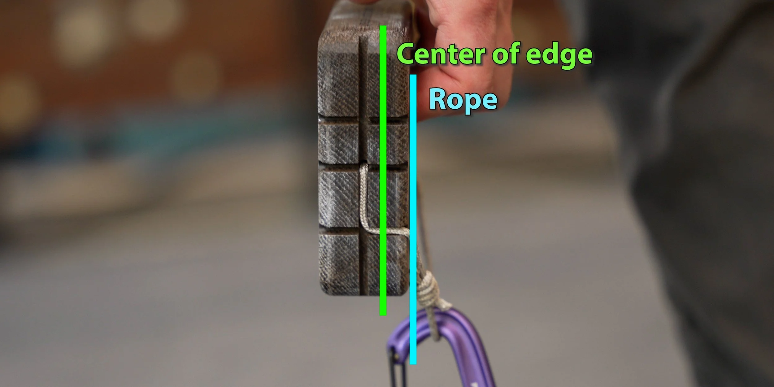 The placement of the rope in relation to the centerline of the edge affects how much the edge will pitch and roll under load. For example, if the rope is placed behind the centerline, it will pitch back when loaded, turning it into more of a sloper. If the rope is placed in front of the center of the edge, it will pitch forward and become more incut. Additionally, if the rope or carabiner can slide side-to-side, it can allow the device to roll to one side when you pick it up. While these can all be useful modifications in niche scenarios, for strength training you typically want the most stable, consistent surface you can get. Thus, an edge that’s never quite in the same position twice or worse, one that might move *during* a rep, is not ideal.