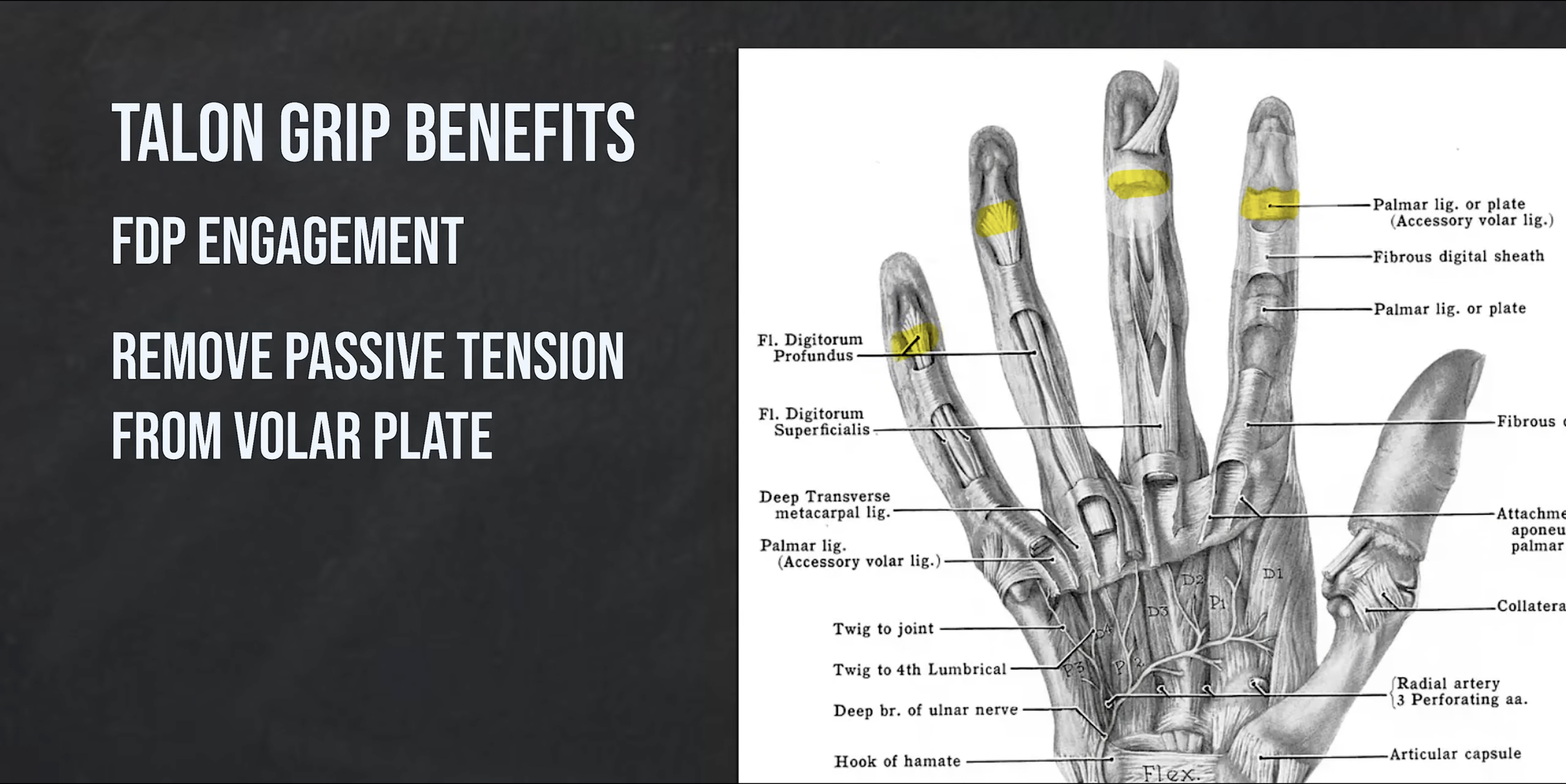 The obvious benefit: you cannot avoid using your FDP here; you have no choice! When that DIP joint is curled in, the FDP is working – it’s literally the only muscle that can do it. You're also removing passive tension from the volar plate; that’s a ligamentous structure at the joint that naturally helps resist extension in a crimp position, essentially giving you a little free strength. The talon grip takes that volar plate assistance away, which means the strength you measure is more "true" FDP strength. That's actually a useful thing to know.