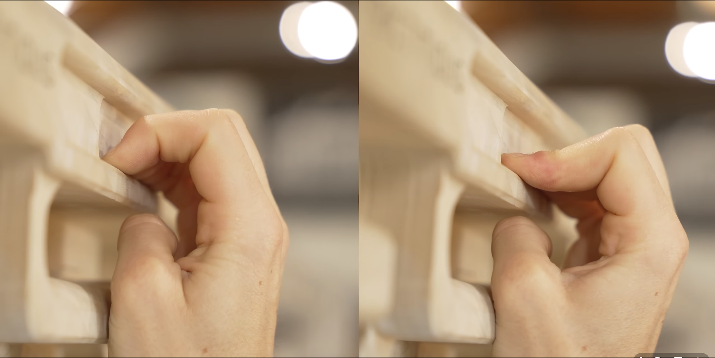 First, it can be quite uncomfortable, depending on how you try to train. With Hamish’s description, rather than distributing force across the flat pad of your finger, it sounds like he’s describing driving straight down into the tip. (The video doesn’t actually show any footage of him doing this, so it’s a bit hard to tell what his actual method was.) However, on a traditional flat edge, this will likely cause a significant pain response, so it’s possible his actual training position wasn’t quite so exaggerated. Either way, a better idea is to use a more ergonomic device for the grip position we’re trying to achieve, such as a comfortable incut edge or a ball-shaped grip device. These allow you to load the FDP while still distributing the force comfortably across your pads.