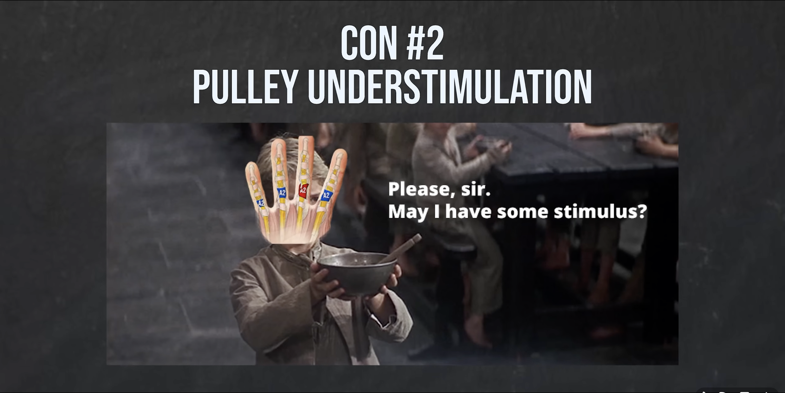 The third con is that you are removing load from the volar plate, which could lead to a similar scenario as the one we just discussed – lack of stimulus to build resilience. For example, if you are pulling hard in this flexed position and suddenly slip into an extended position, you risk a volar plate injury.